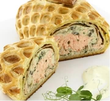 "Or if you prefer something more elaborate and much more exalted, you're you're a coulibiac. That's a Russian dish that's rated by some as one of the toughest things in the world to make well damn thing is filled with salmon, rice, hard-boiled eggs, mushrooms, and dill, and if your timing is off by a split second the puff pastry turns to mush."